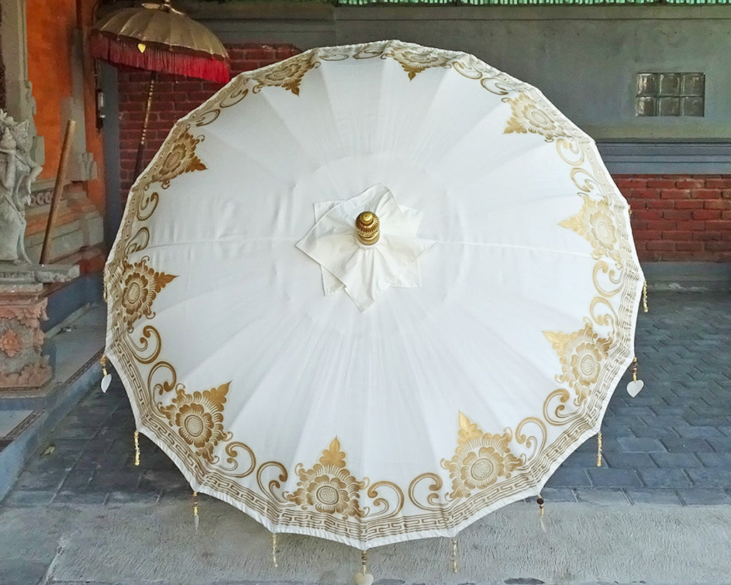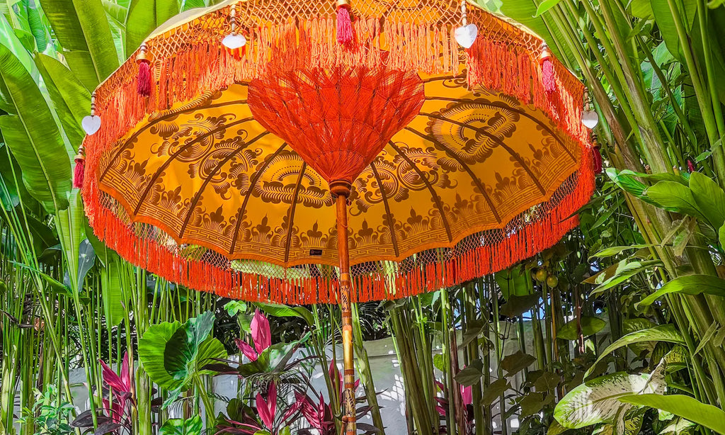 A magnificent piece of craftsmanship that has been lovingly created with precision and passion. Each parasol is a work of art, taking up to 30 days to complete. With its intricate details and beautiful colors, the Baliaric Balinese Parasol is the perfect addition to your home. Create your own oasis and relax in style with this spectacular parasol.