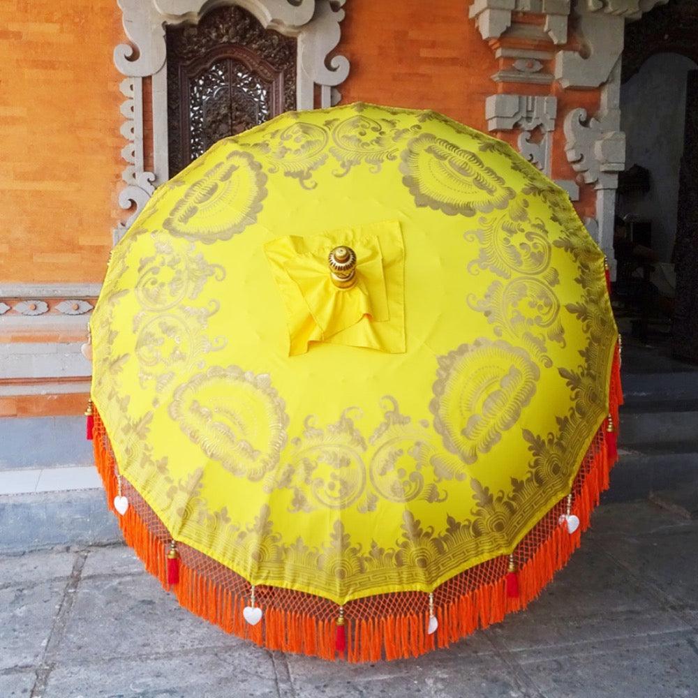 The pole of the parasol is made from hand-carved durian wood, with gold-painted details and a solid brass accent. Additionally, the foundation is secured by bamboo spokes, making it sturdy and reliable.