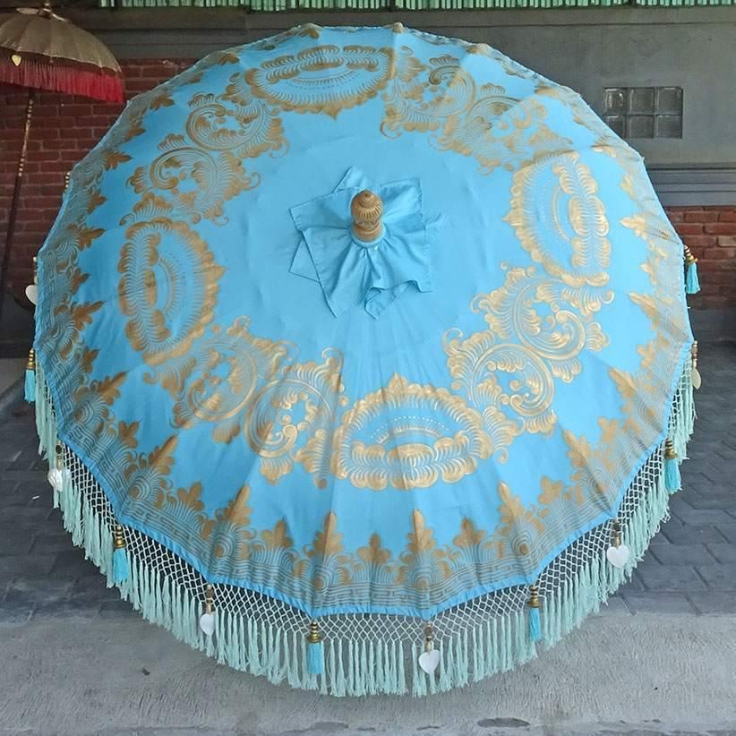 The pole of the parasol is made from hand-carved durian wood with gold-painted details and a solid brass accent, making it not just a functional shade but also a piece of decor. The bamboo spokes provide a secure foundation, making it easy to assemble and disassemble.
