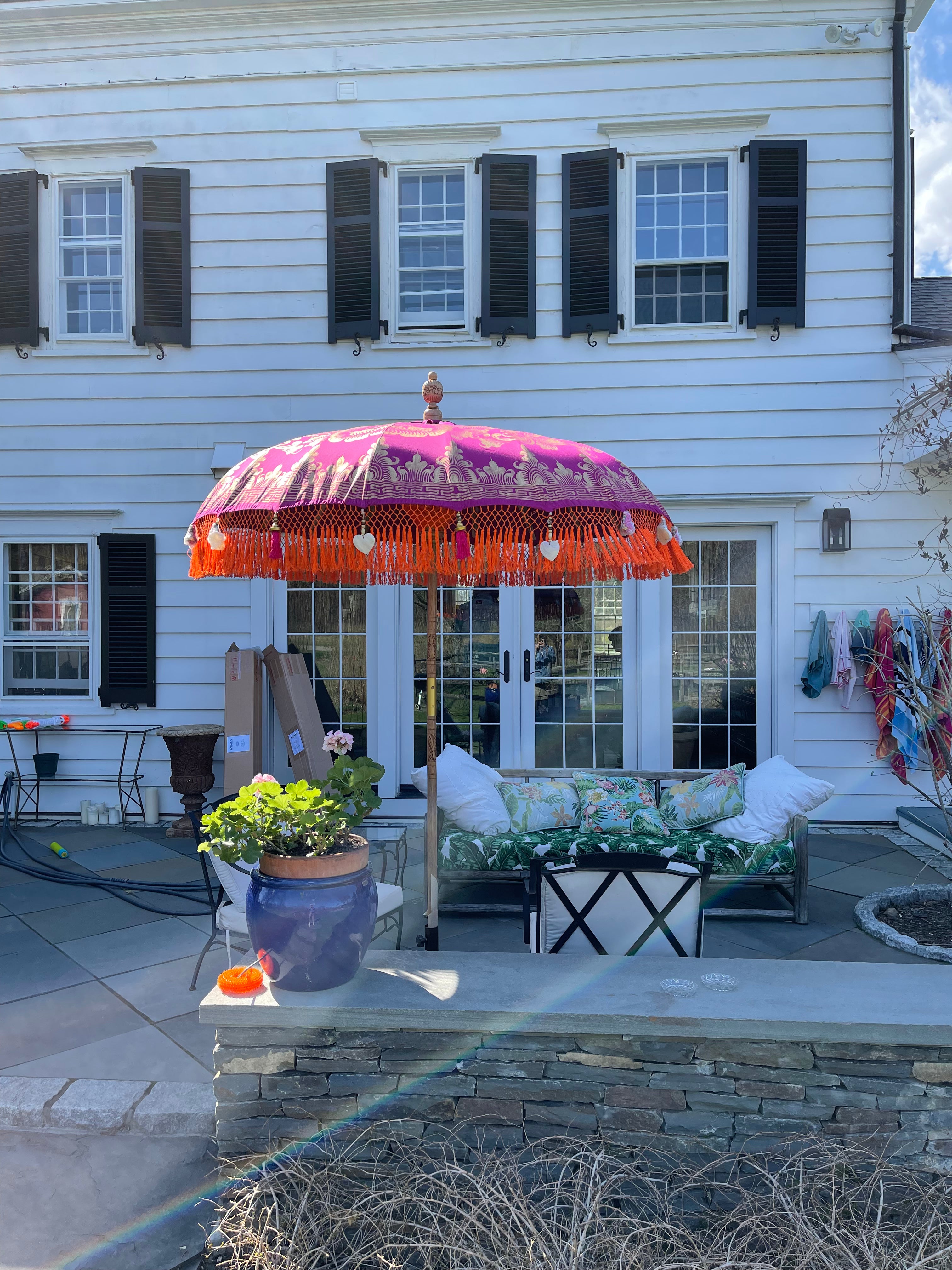 Introducing the Cecilia Balinese Parasol - a stunning piece of craftsmanship that will add a pop of color to any outdoor space. The parasol features a vibrant pink purple canvas with a gold hand-painted design that is sure to turn heads. The orange inner threading and outer fringe, adorned with purple tassels, gold and wooden beading, and heart-shaped seashells, give it a unique and eye-catching look.