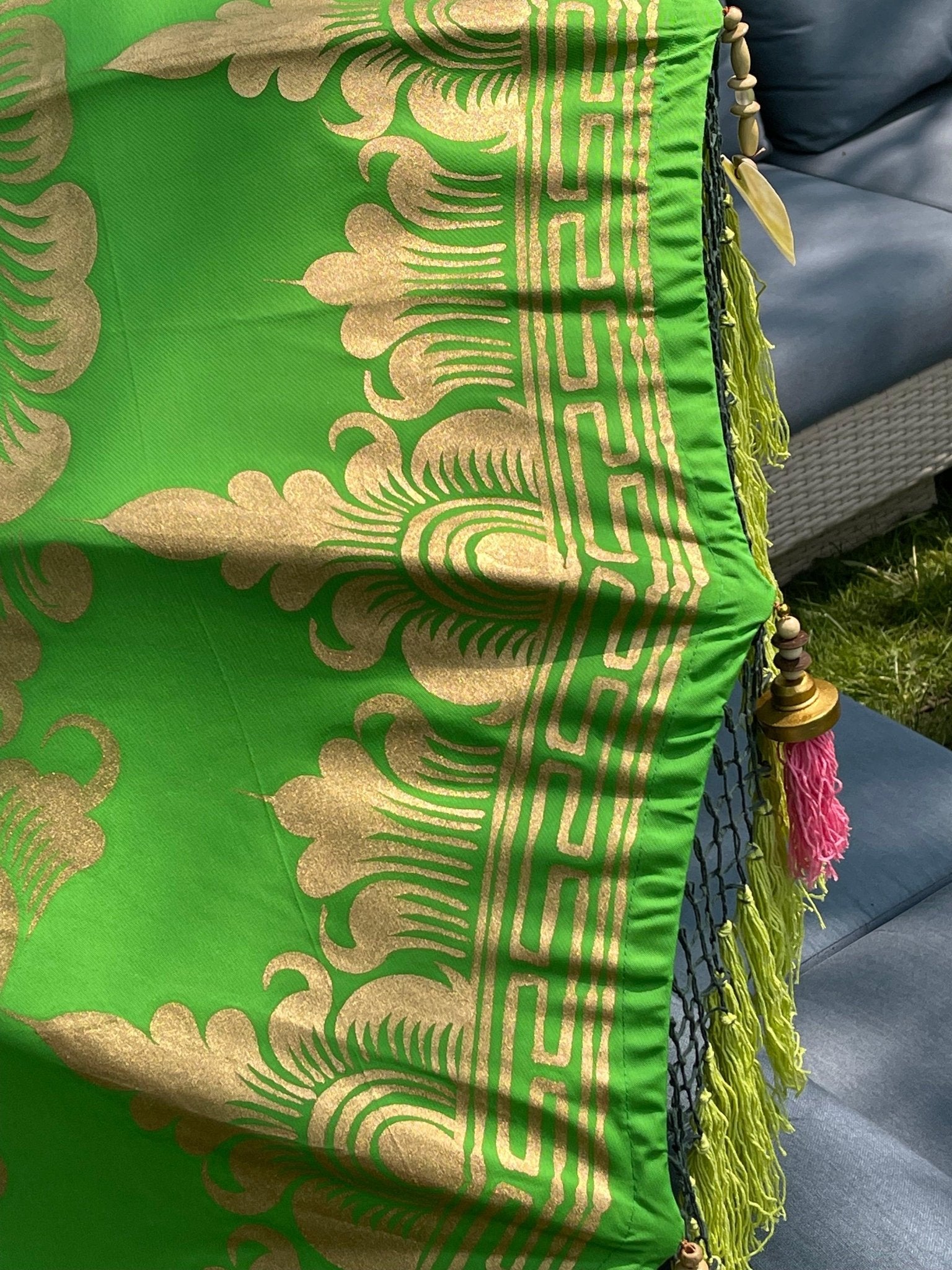 Introducing the Samantha Parasol - a stunning piece of art that will add a touch of tropical elegance to your outdoor space. The parasol is handcrafted with the utmost attention to detail and features a vibrant green canvas with a gold hand-painted design that is sure to catch the eye. The pink inner threading and light green outer fringe, adorned with pink tassels, gold and wooden beading, and heart-shaped seashells, give it a unique and striking look.