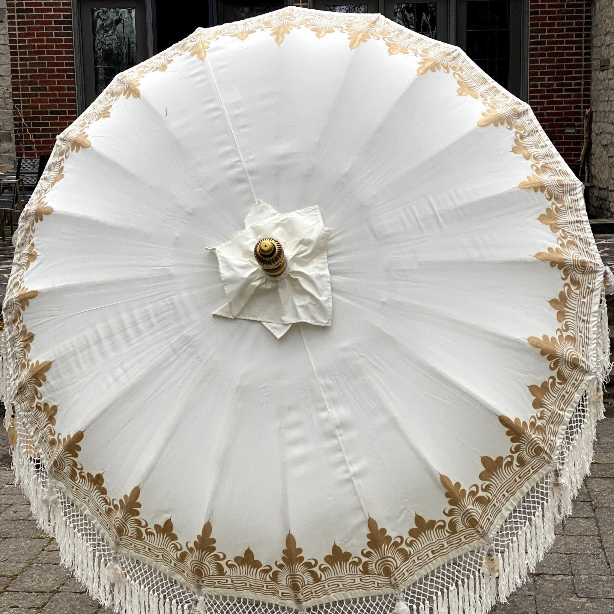 The Gold Parasol is the epitome of luxury and elegance. With its gleaming golden rim hand-painted on a pristine white canvas, it's sure to add a touch of sophistication to any outdoor setting. The white inner threading and fringe, paired with the gold tassels, wooden beading, and heart-shaped seashells, create a stunning visual display that is sure to impress.
