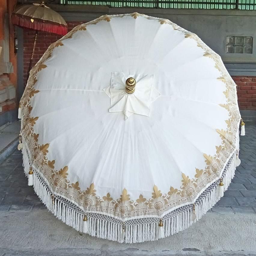 The pole is crafted from durable durian wood and features gold-painted details and a solid brass accent. The bamboo spokes provide a sturdy foundation, ensuring that your parasol remains secure and stable, even in windy conditions.