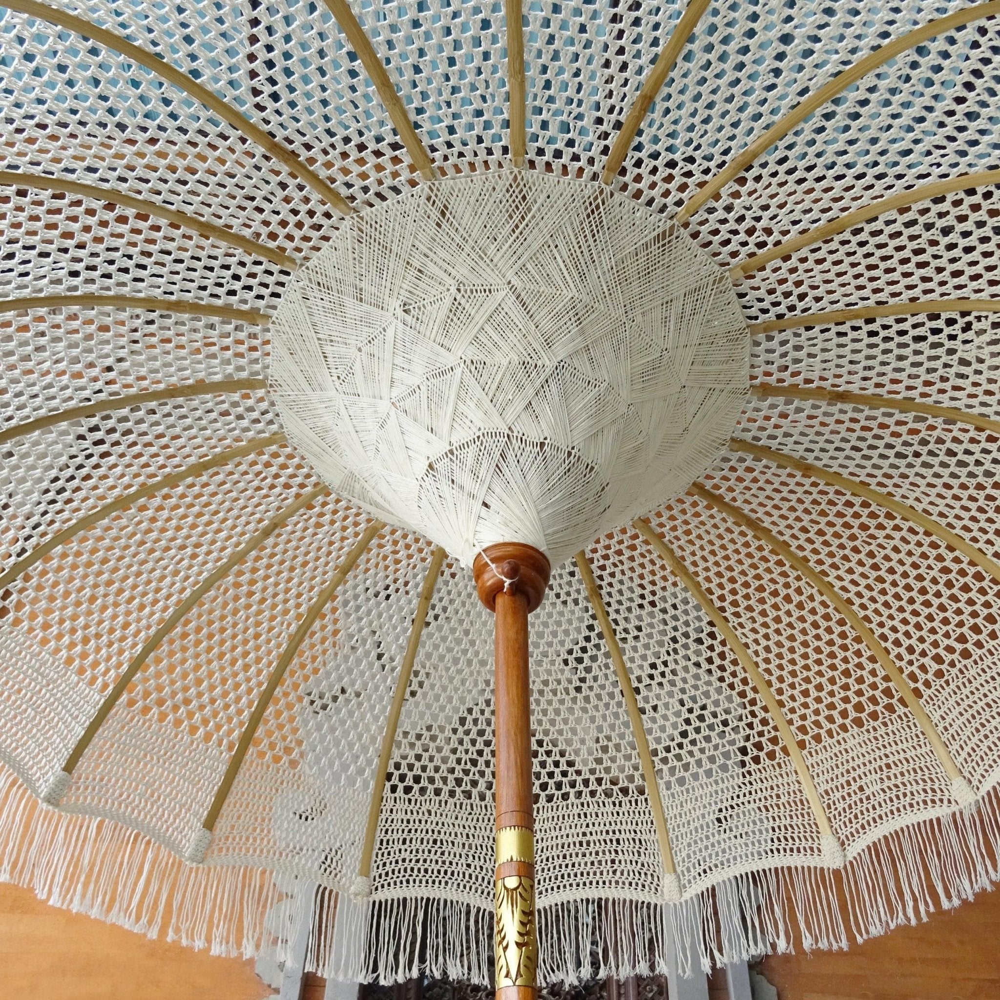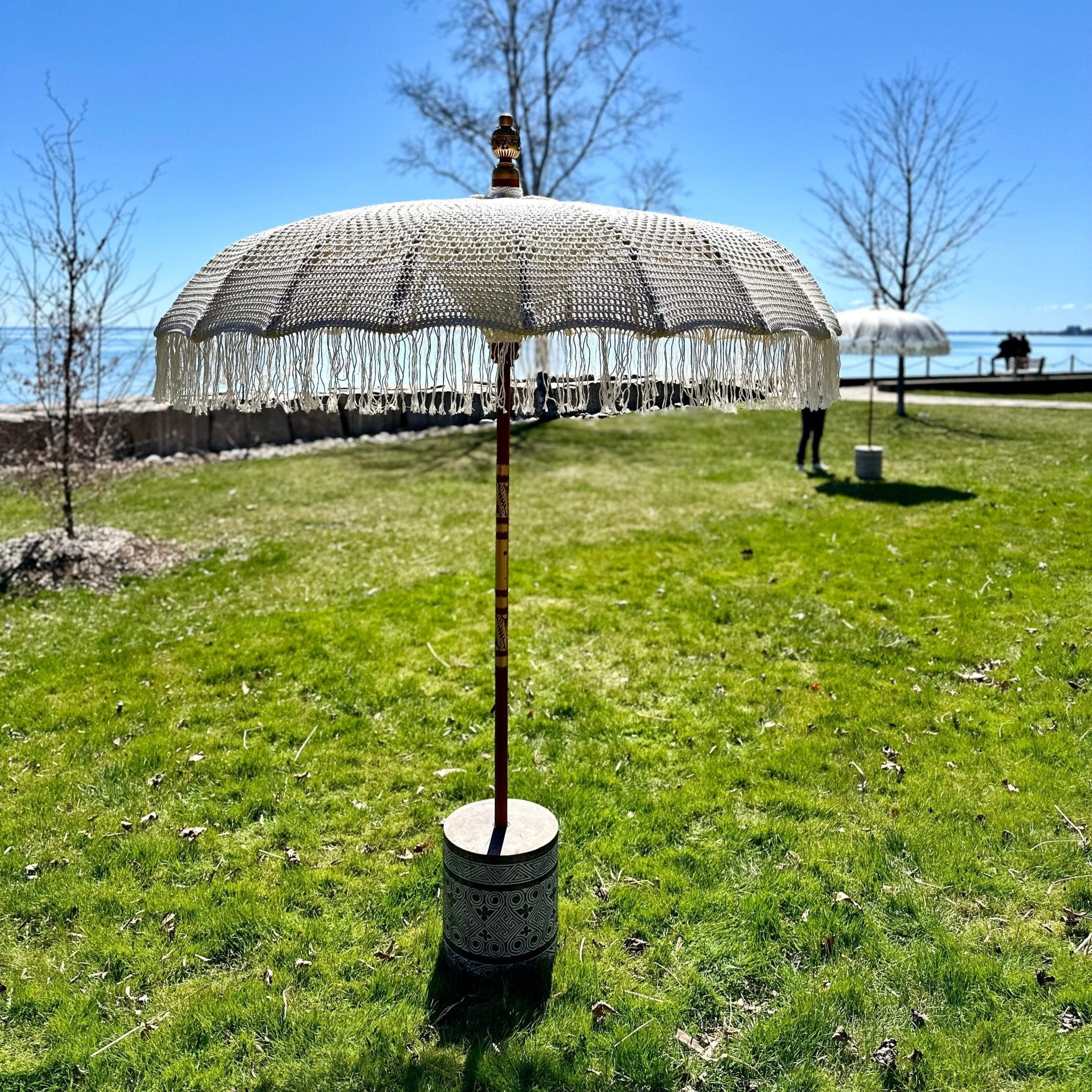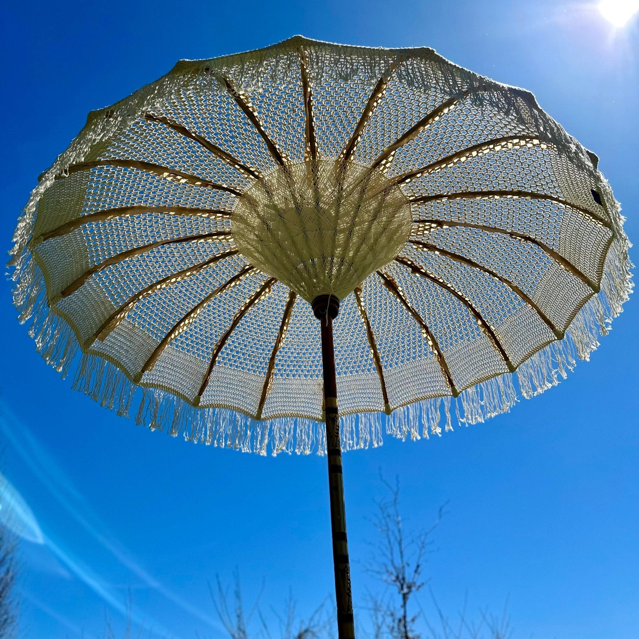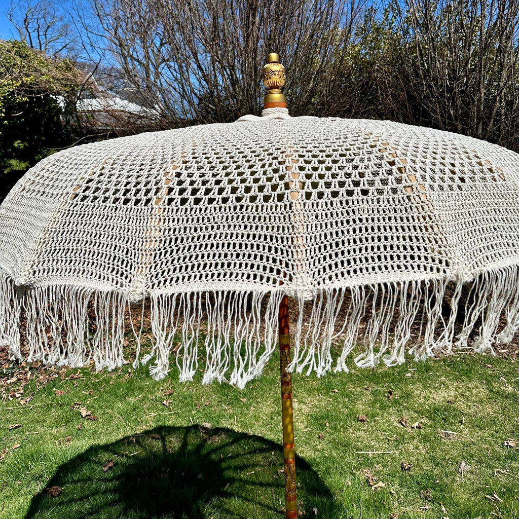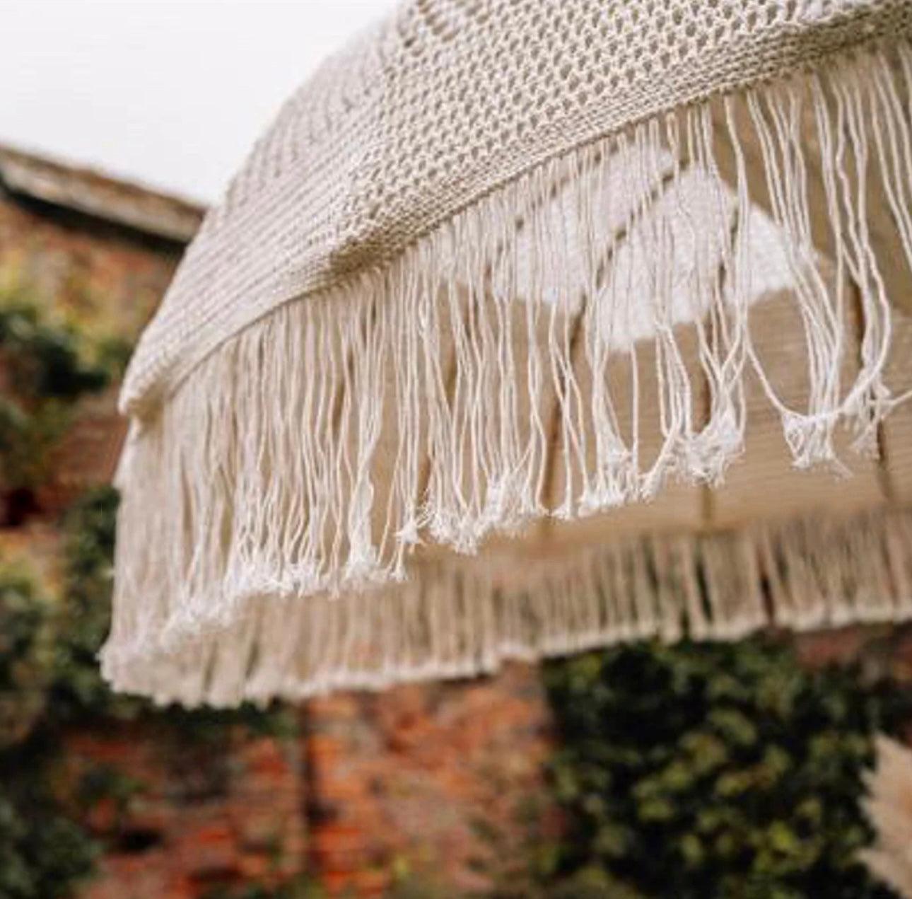 Explore the interplay of classic craftsmanship and sleek design with our exquisite Handcrafted Macramé Umbrella. These intricately hand knotted pieces demonstrate the timeless art of macramé, transforming threads into a beautiful display. Their unique design casts a soft, splotchy light, perfect for a serene and comfortable atmosphere in any outdoor area. They are perfect for special occasions, providing a hint of luxury and sophistication.