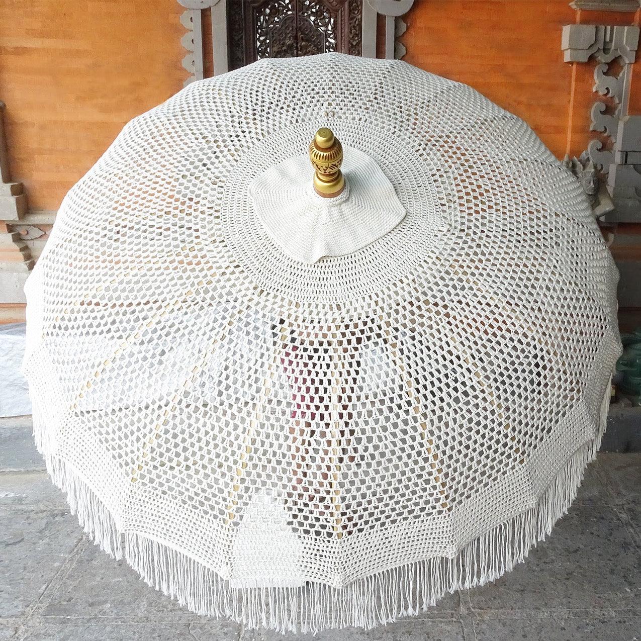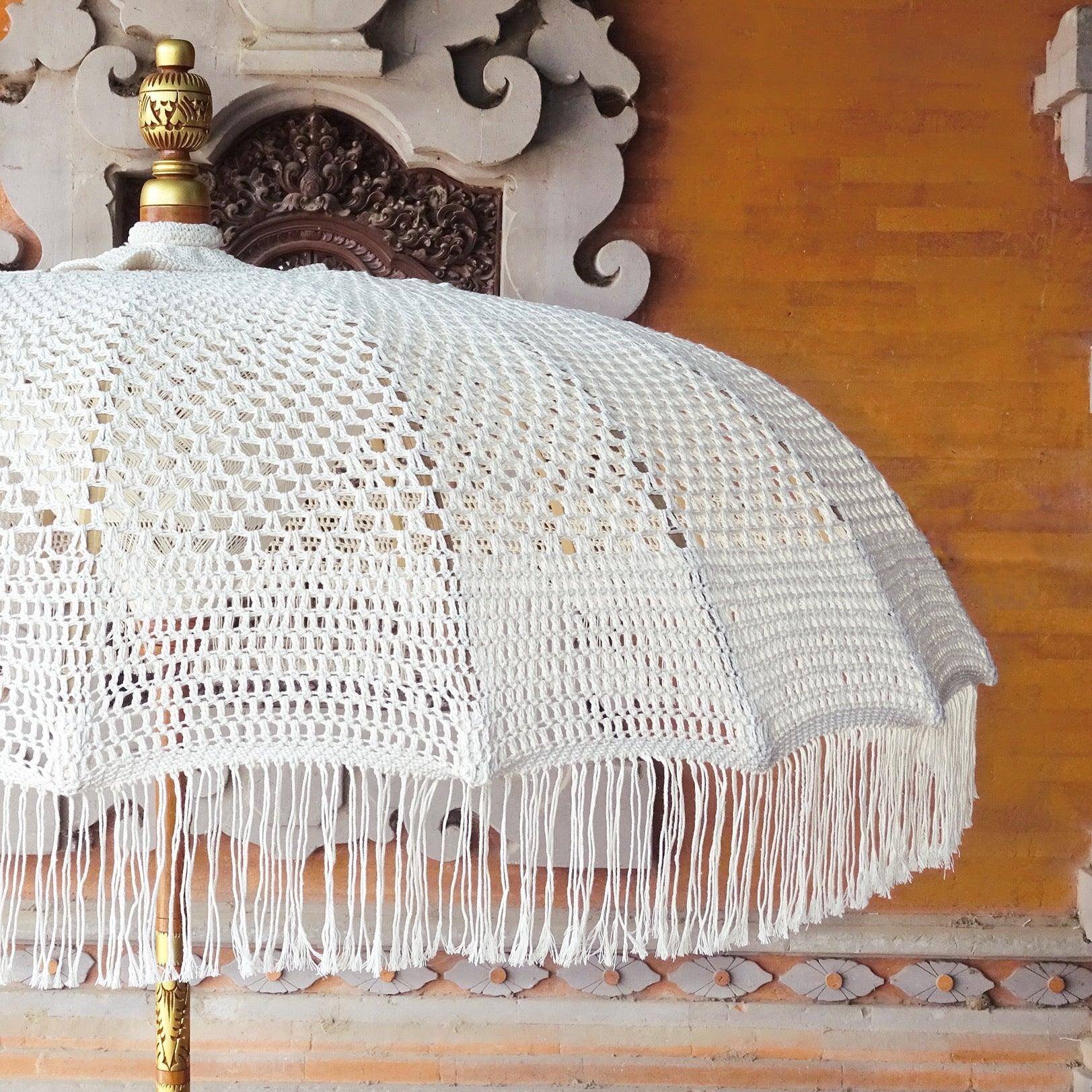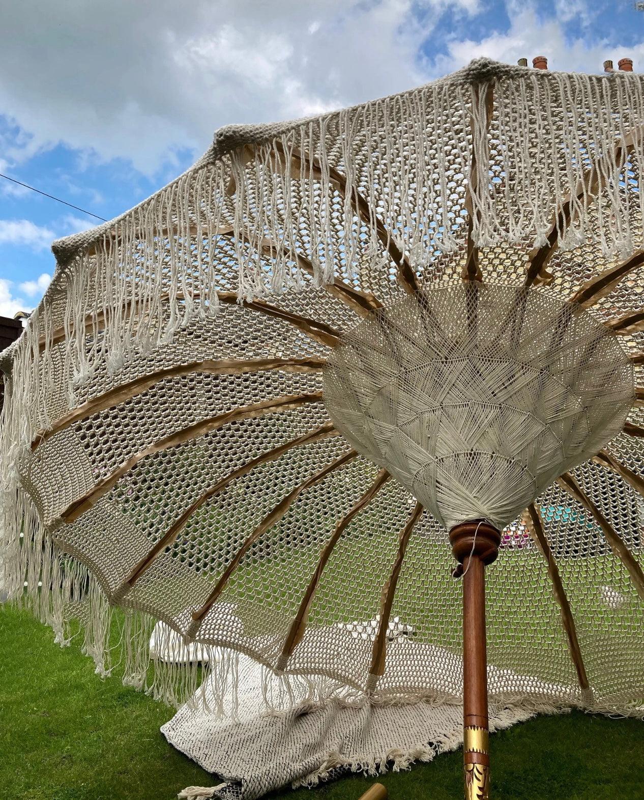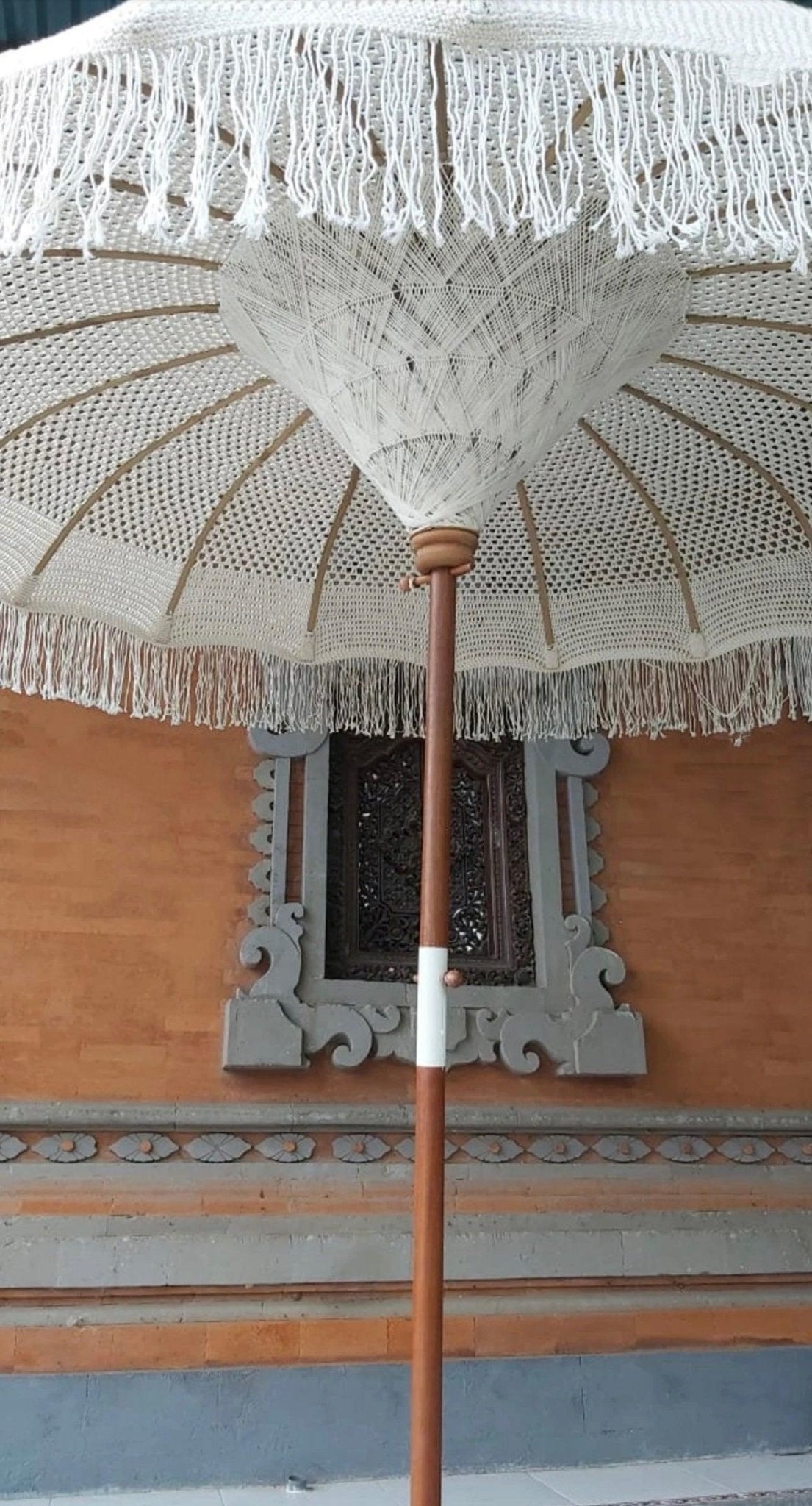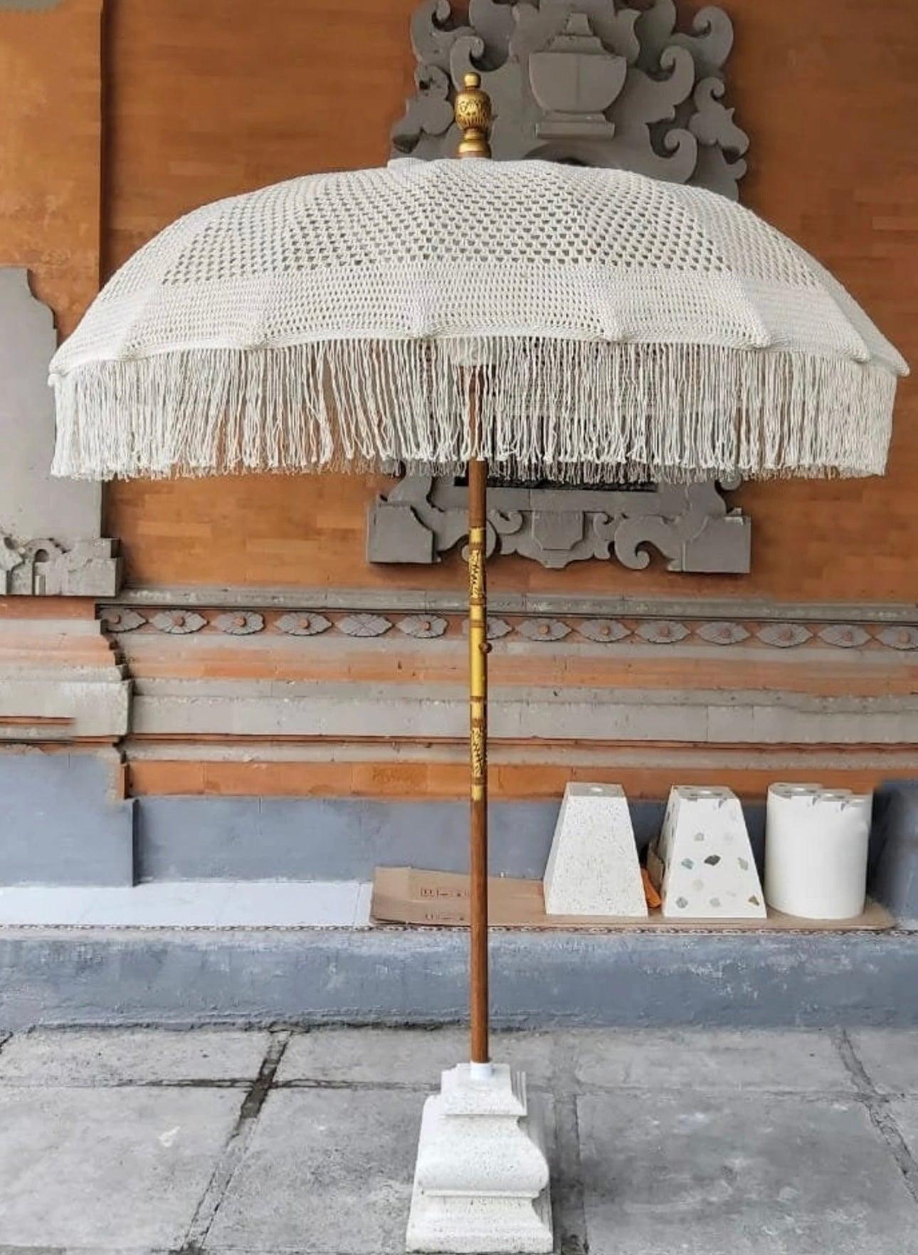 Explore the interplay of classic craftsmanship and sleek design with our exquisite Handcrafted Macramé Umbrella. These intricately hand knotted pieces demonstrate the timeless art of macramé, transforming threads into a beautiful display. Their unique design casts a soft, splotchy light, perfect for a serene and comfortable atmosphere in any outdoor area. They are perfect for special occasions, providing a hint of luxury and sophistication.