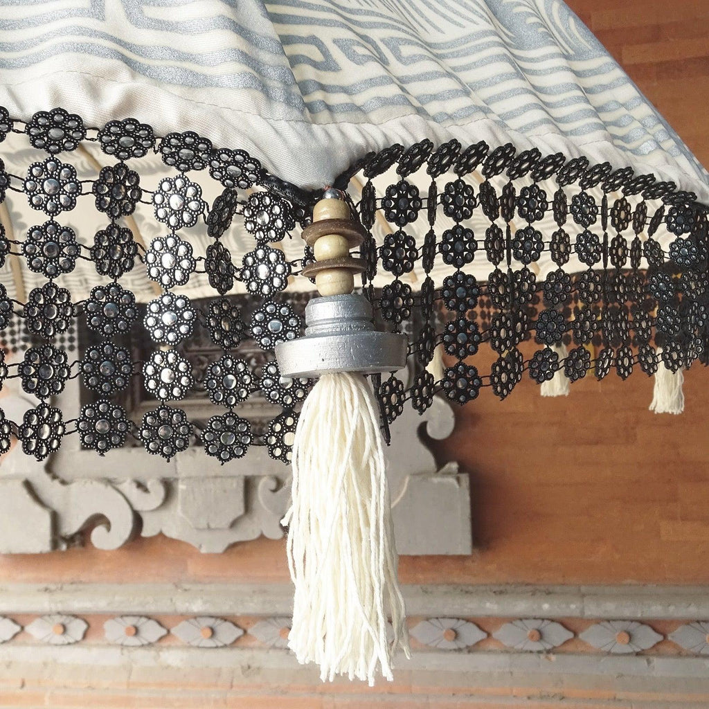 A regal, silver and cream garden parasol, adorned with silver ink paintings crafted by the artisans of Bali. The durian wood pole boasts intricate carvings and silver paint, while the join and pegs are solid brass.