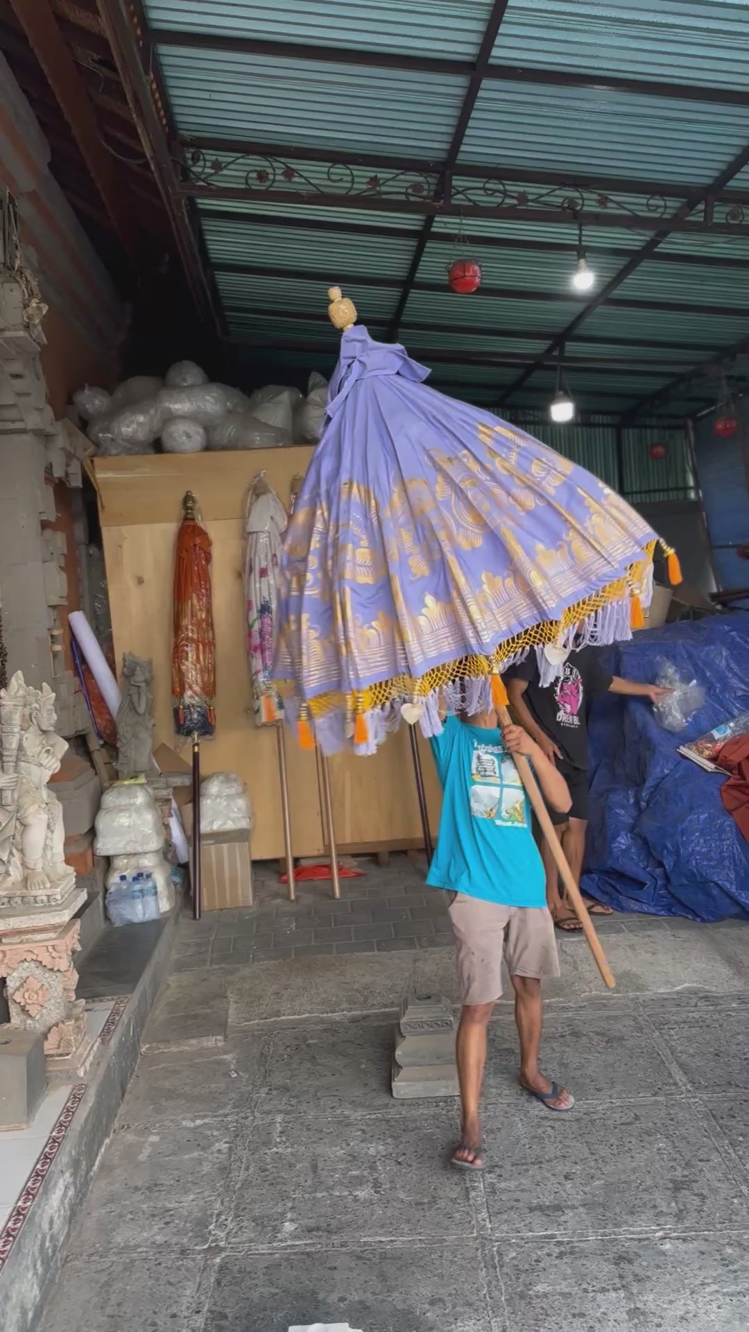 The hand-carved durian wood pole, detailed with gold-painted accents and solid brass fittings, reflects exquisite attention to detail. Inside, the parasol features meticulously handwoven orange threading, showcasing artisan skill in every piece.