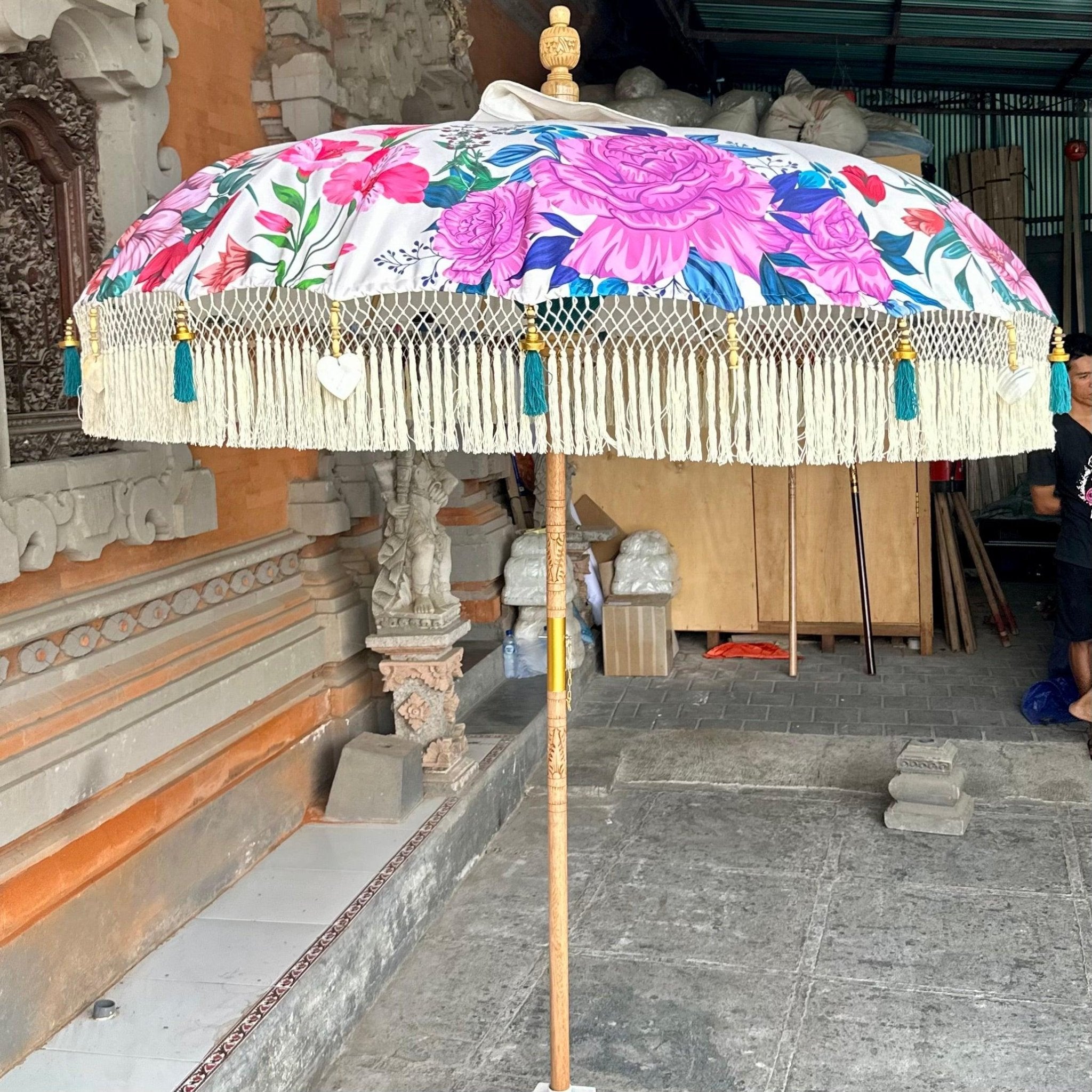 Transform your outdoor space with the Daisy Parasol, a stunning fusion of artistry and functionality. This luxury outdoor umbrella is handcrafted in Bali using premium bamboo and features intricate carvings with subtle gold accents for a timeless design.