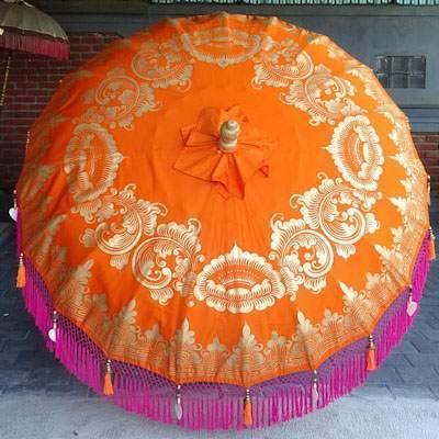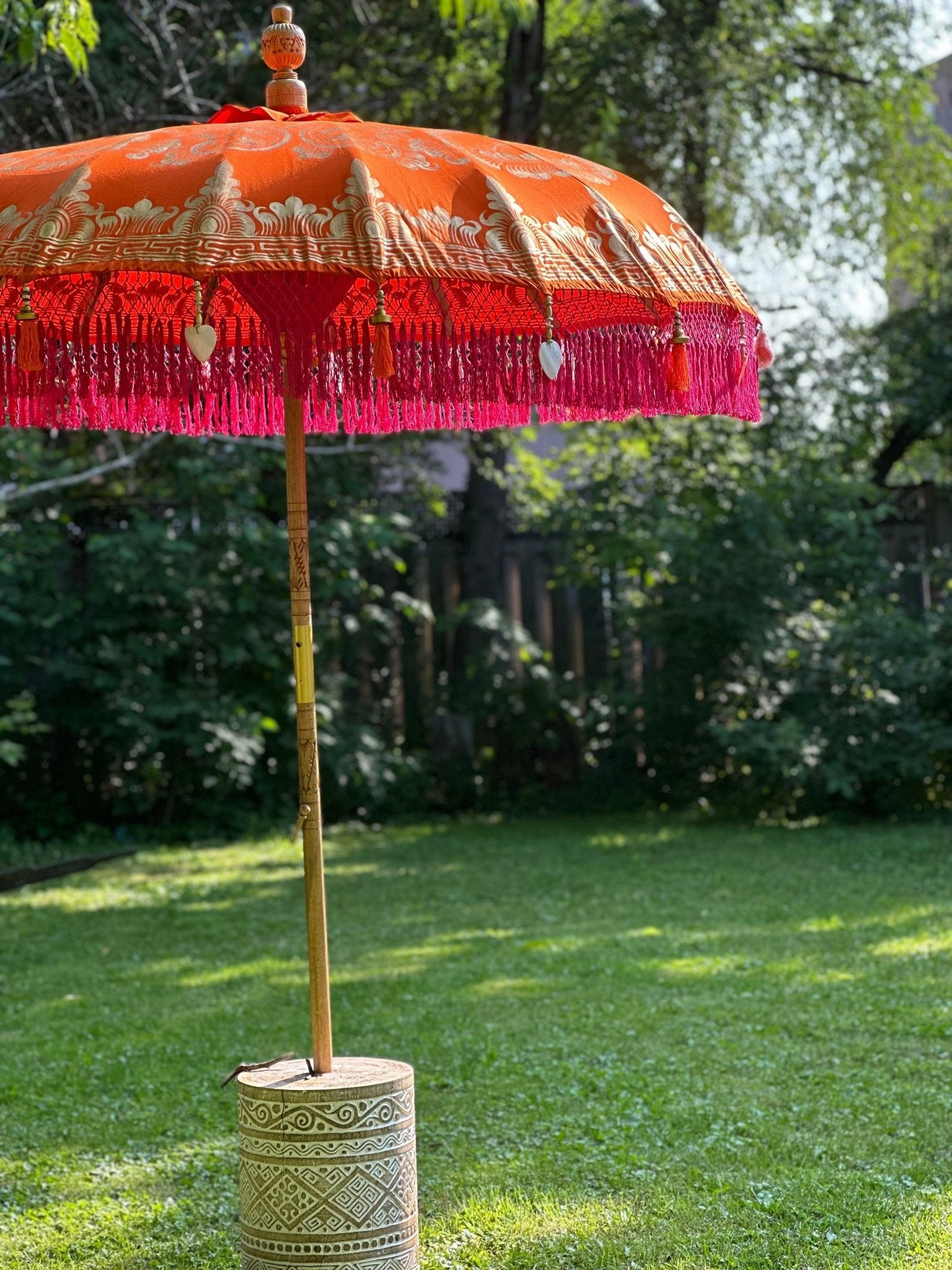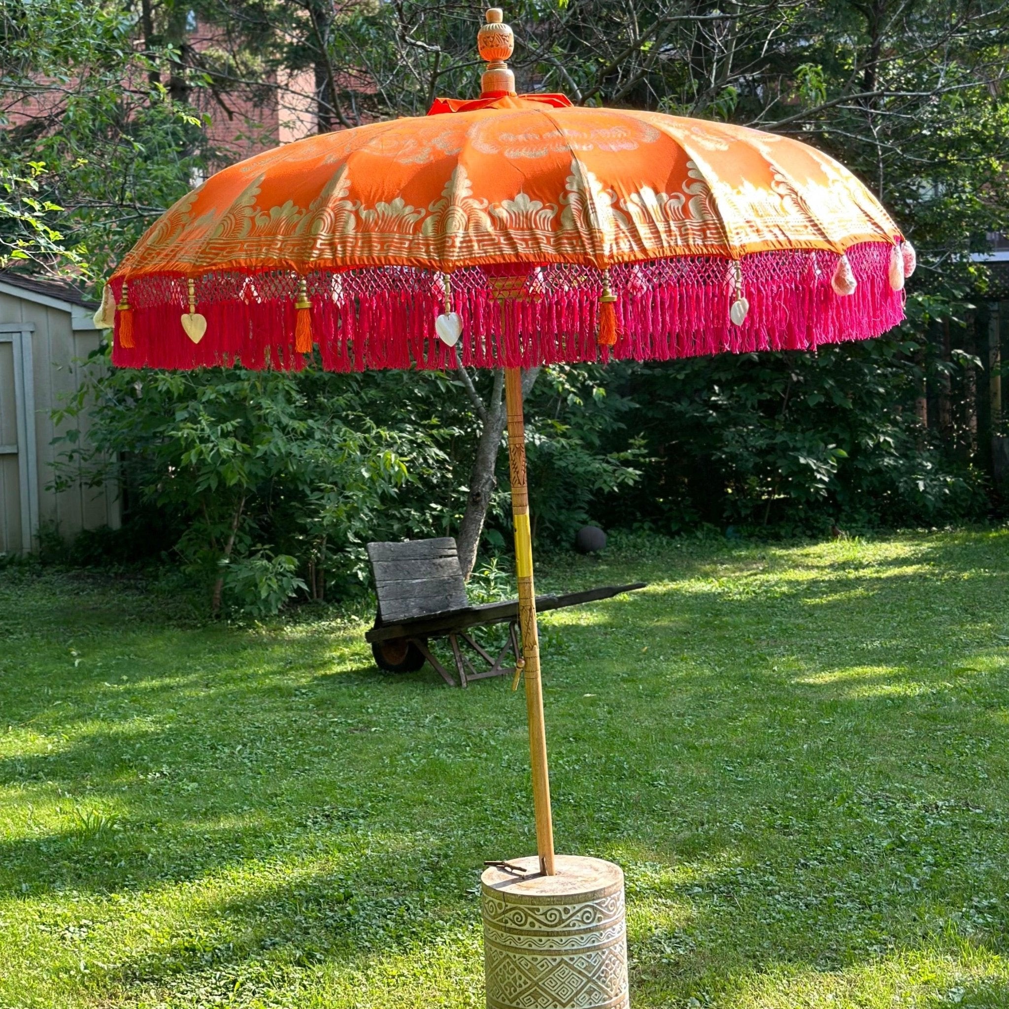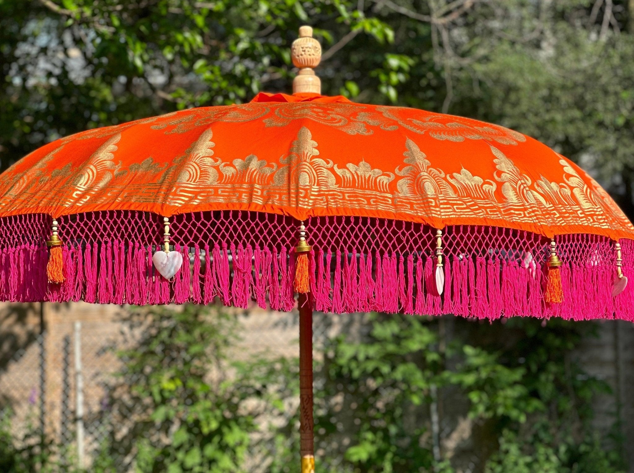 Introducing the Darling Parasol - a stunning piece of art that will add a touch of exotic elegance to your outdoor space. The parasol is handcrafted with the utmost attention to detail and features a vibrant orange canvas with a gold hand-painted design that is sure to catch the eye. The fuchsia inner threading and outer fringe, adorned with orange tassels, gold and wooden beading, and heart-shaped seashells, give it a unique and striking look.