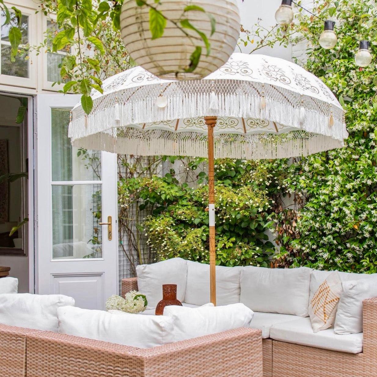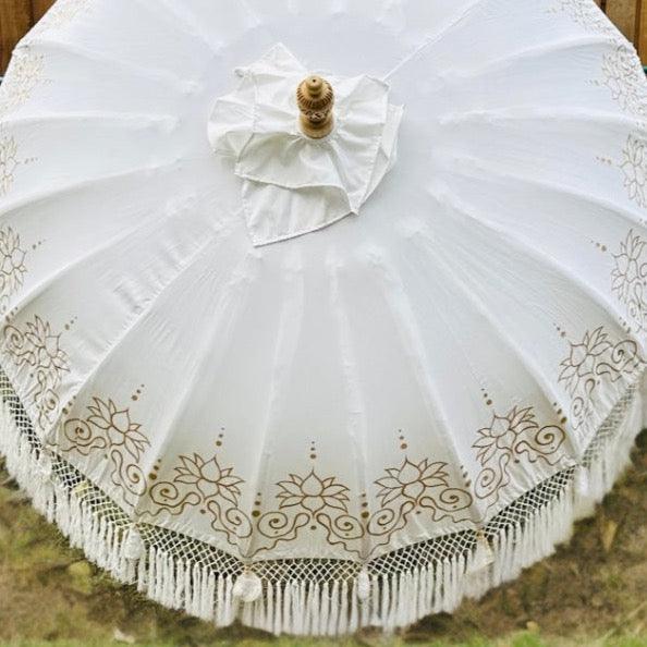 Our Parasol features a golden hand-painted design on white with an white inner threading and outer fringe. Adorned with white tassels, gold and wooden beading, and heart-shaped seashells, it is sure to add a touch of elegance to any space.
