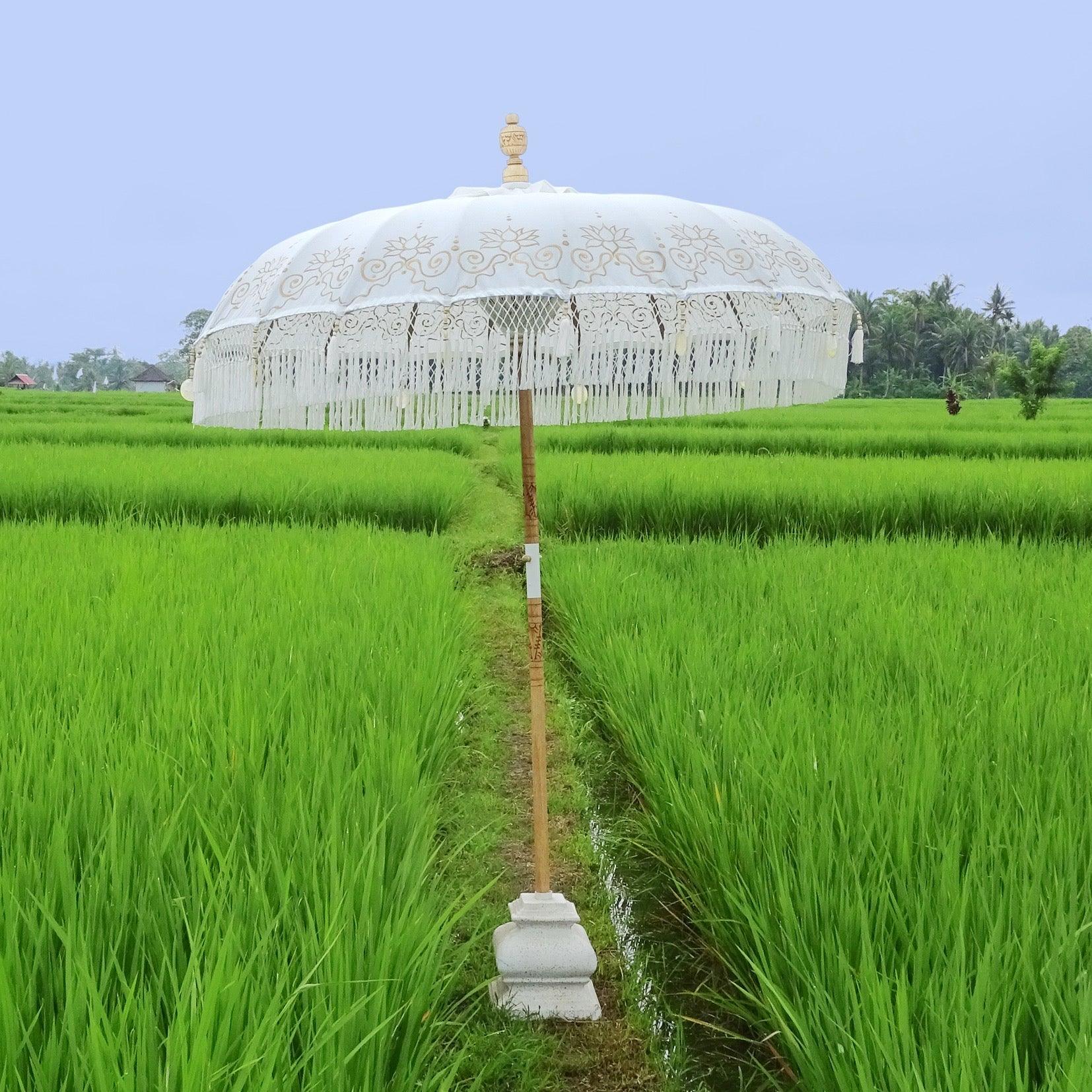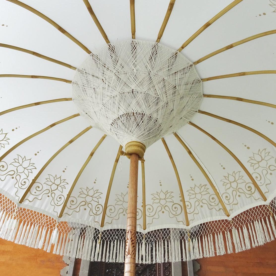 Moreover, the pole of the parasol is made from hand-carved durian wood, with white-painted details and a solid brass accent. Additionally, the foundation is secured by bamboo spokes, making it sturdy and reliable.