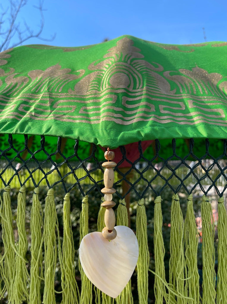 Introducing the Samantha Parasol - a stunning piece of art that will add a touch of tropical elegance to your outdoor space. The parasol is handcrafted with the utmost attention to detail and features a vibrant green canvas with a gold hand-painted design that is sure to catch the eye. The pink inner threading and light green outer fringe, adorned with pink tassels, gold and wooden beading, and heart-shaped seashells, give it a unique and striking look.