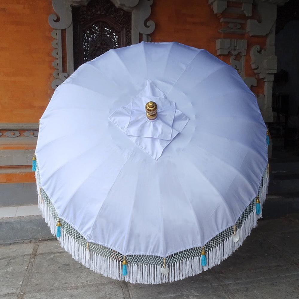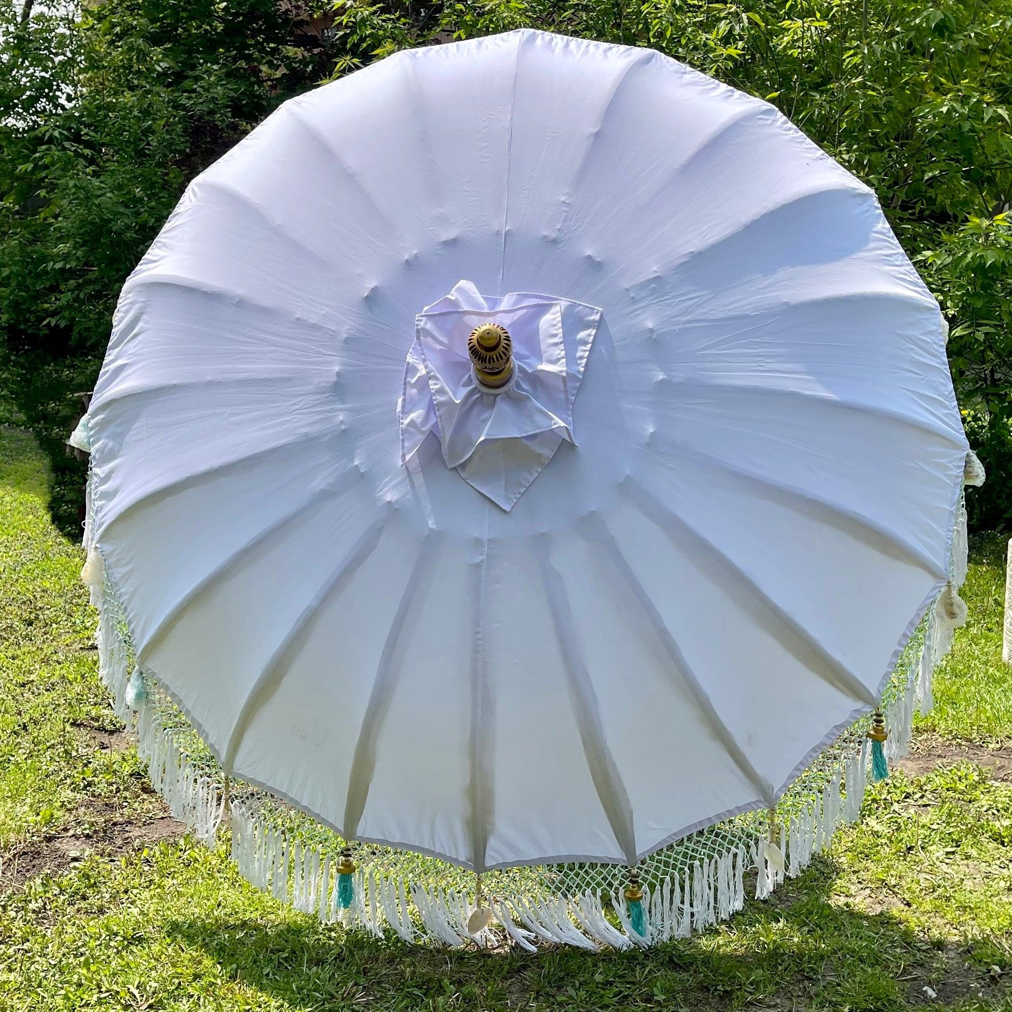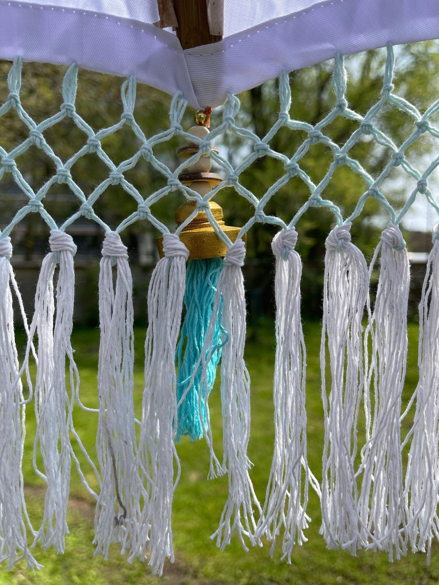 Wendy Parasol features a white canvas fabric  with a turquoise inner threading and the outer fringe is white, adorned with turquoise tassels, gold and wooden beading, and heart-shaped seashells.
